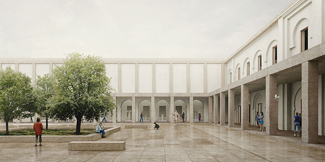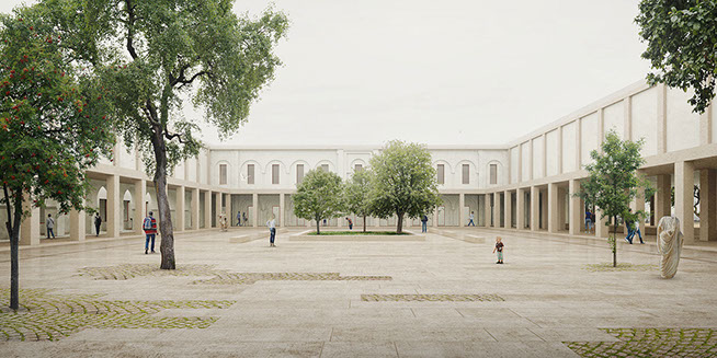 The proposal follows the historic axiality imposed by the Roman urban design, with the Decumanus Maximus main axis as the prevalent datum of symmetry. The newly introduced exterior architecture is in dialogue with the historical site and existing buildings, utilising classical rhythm and proportion as well as local Thala stone material to imbed the contemporary architecture into its historically prominent setting.