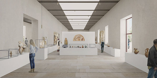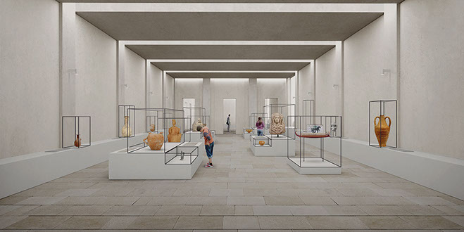 With new building volumes, a new museum courtyard in enclosed within the site. An open air access is provided between the sculpture yard and the surrounding Acropolis to provide a comprehensive museal setting. The Acropolium Cathedral, set within the main Decumanus Maximus, is proposed as an open library and event space showcasing the history of Carthage. A further entry to the museum is provided from the interior of the Cathedral.