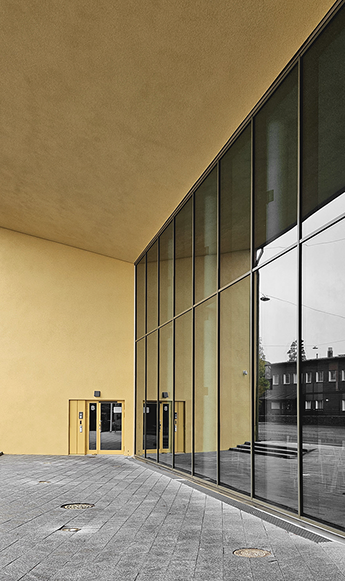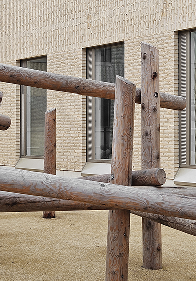 While the light brick facade communicates stability and safety, the colorful articulation of the main entrance areas speak of warmth and playfulness and also respond to the surrounding cityscape. Variations in the brickwork create a visual rhythm in the facades and the expansive green roof surfaces further emphasize the geometry of the three "houses".